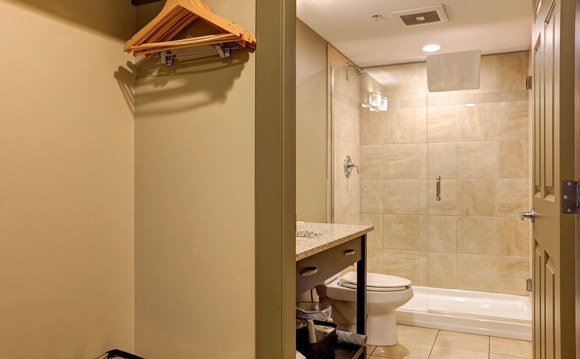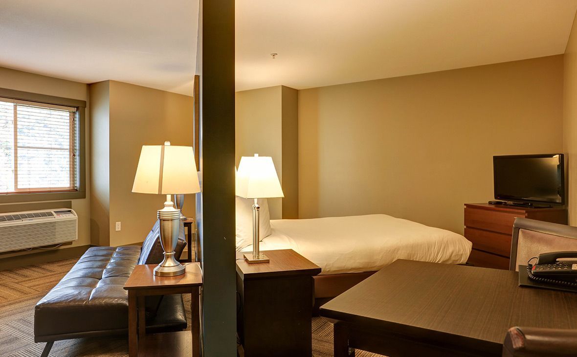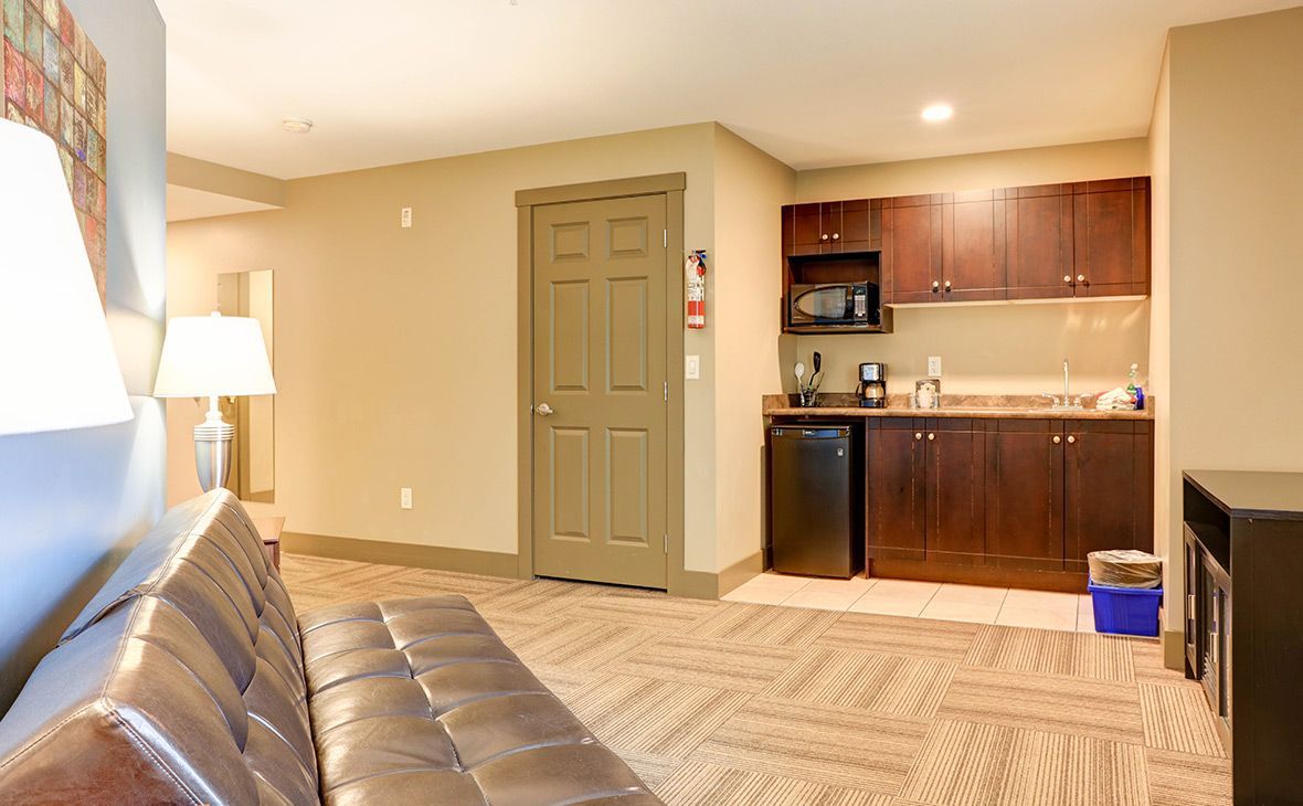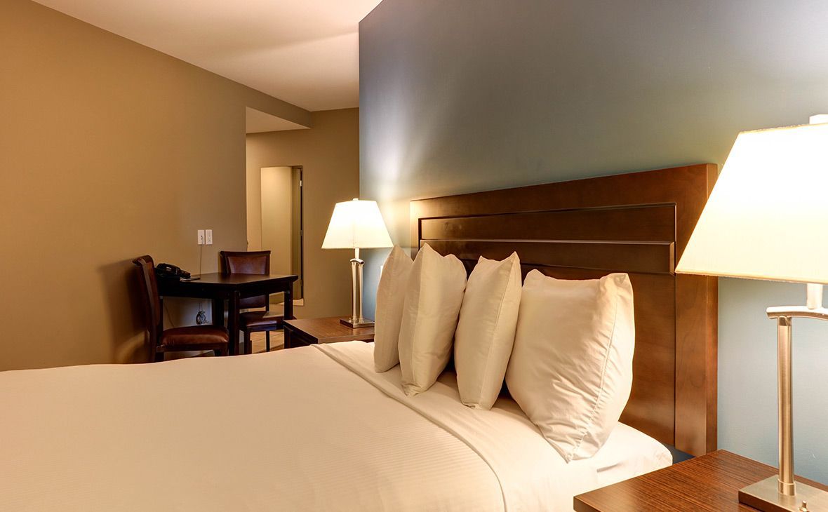 Here you will find a comfortable queen bed, couch bed, and a dining table perfect for two. The room also has a mini-kitchenette area (has extra counter space with a sink), microwave and mini-fridge, coffee maker, kettle, toaster, portable hot plate, cooking utensils, iron and iron board, flat screen television, alarm clock, free WiFi, heating and air conditioning. The heated bathroom has a walk-in shower (no tub). A feature wall separates the bedroom from the living space. This room accommodates a maximum of 3 people. If you require any assistance, our Front Desk Agents and staff are available 24/7, please dial 0 on your room telephone to contact the Reception. We hope you enjoy your stay!